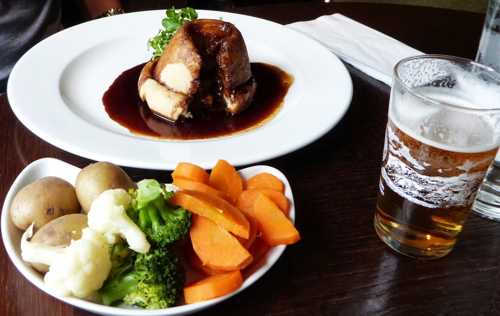 Venison Suet Pudding, veggies and the obligatory glass of ale |